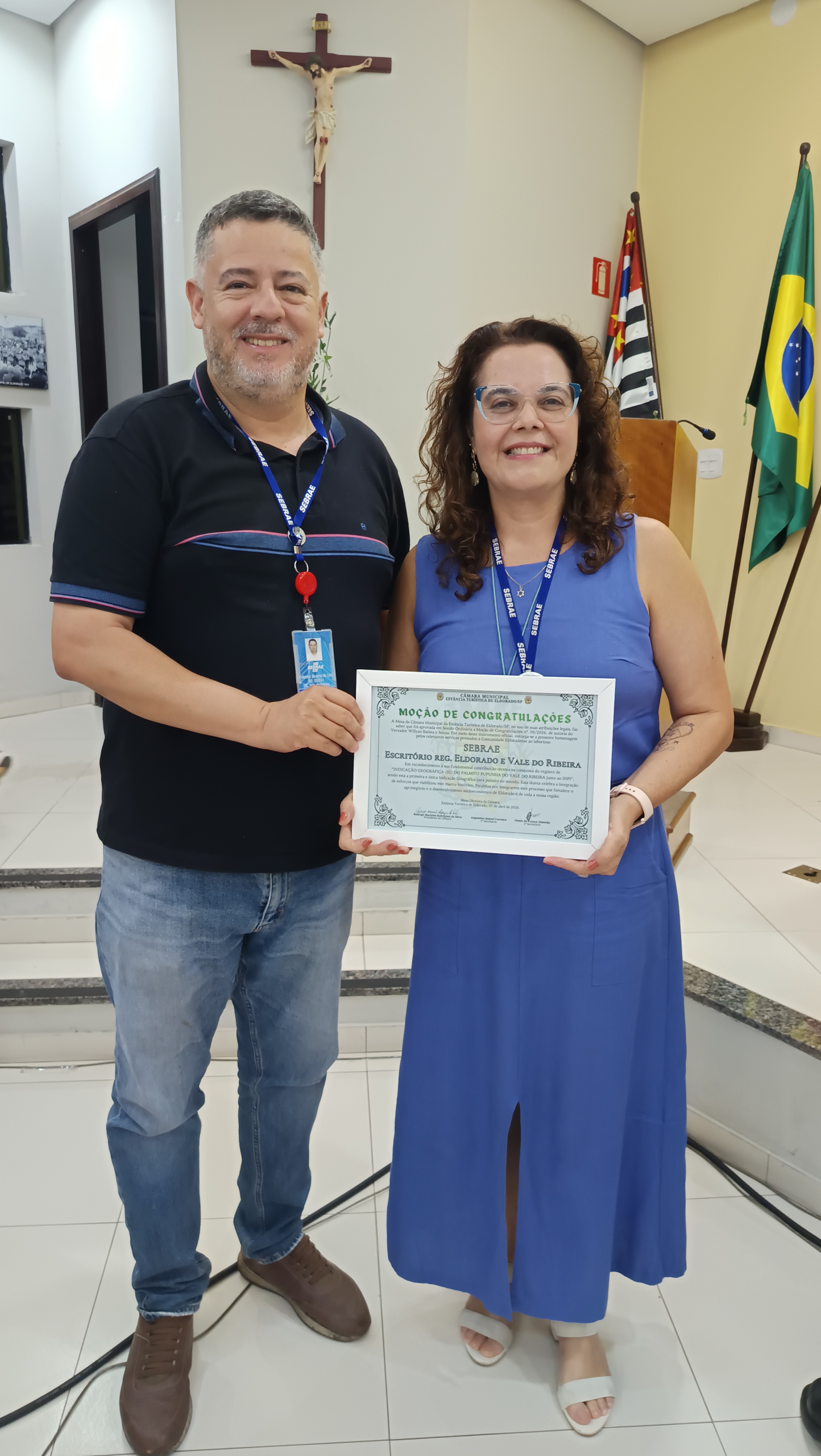 Em reconhecimento à contribuição técnica na conquista do registro da Indicação Geográfica (IG) do Palmito Pupunha, o Escritório Regional do Sebrae-SP no Vale do Ribeira recebeu Moção de Congratulações da Câmara de Eldorado. A homenagem foi entregue na noite de terça-feira (7) para a gerente regional do Sebrae-SP, Michelle dos Santos, e o consultor de negócios Anderson Bezerra de Lima.