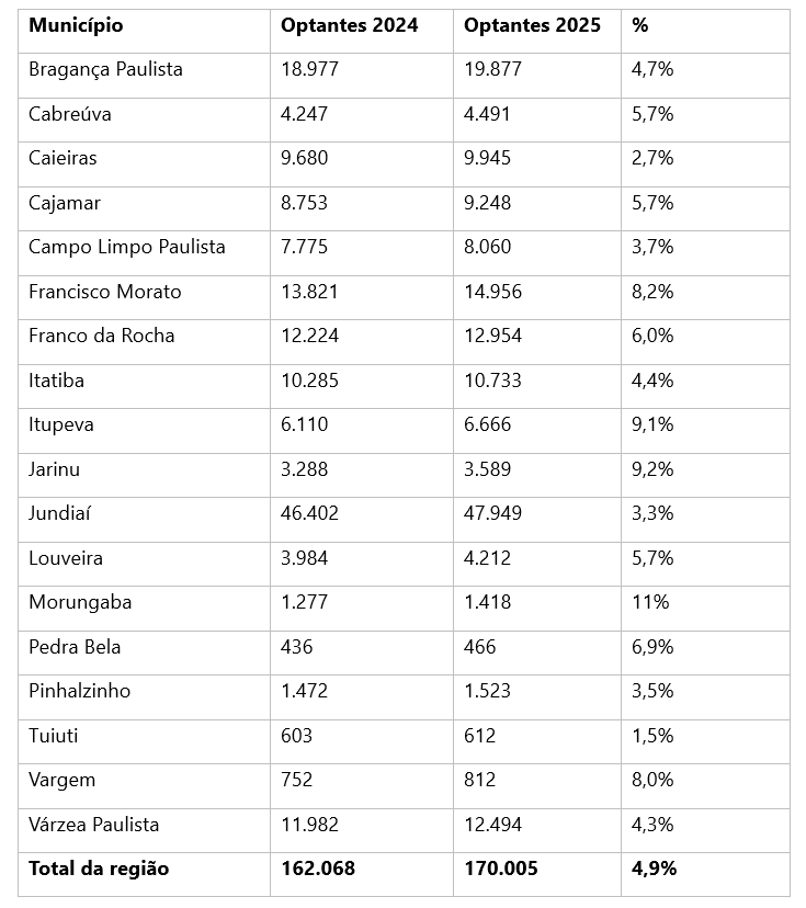 Os dados ainda apontam que todas as 18 cidades da região apresentaram crescimento no número de MEIs, com destaque para as cidades de Morungaba, Jarinu, Itupeva, Francisco Morato e Vargem, que lideraram o aumento percentual no número de optantes.