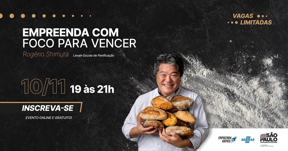 Com o objetivo de mostrar a donos e donas de pequenos negócios, assim como a futuros empreendedores e empreendedoras como é possível ter sucesso em um mercado competitivo como o de alimentação e panificação, o Sebrae-SP oferece no dia 10 de novembro, das 19h às 21h, o evento online gratuito “Empreenda com foco para vencer”, com Rogério Shimura. As pessoas interessadas podem se inscrever pelo link https://sebrae.contatosebraesp.com.br/empreendaparavencer. Mais informações pelo telefone 0800 570 0800.