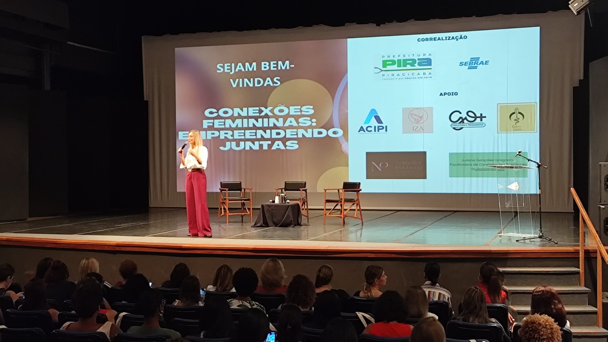 O encontro “Conexões femininas: empreendendo juntas”, realizado nesta quinta-feira (27), no Teatro do Engenho em Piracicaba, reuniu um público de cerca de 100 pessoas. A ação teve objetivo de trazer um diálogo sobre empreendedorismo feminino, reuniu painéis com temas relacionados a autenticidade, estratégias de negócios e bem-estar, e foi promovido pelo Sebrae-SP e Prefeitura de Piracicaba.
