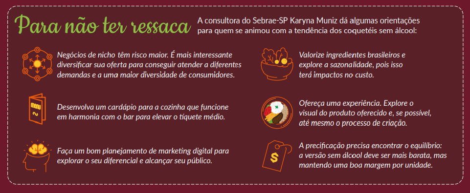 Karyna Muniz também orienta que o bar ou restaurante ofereça um cardápio de comida que harmonize com os drinks sem álcool. “O bar tem que conciliar com a cozinha, isso faz com que o tíquete médio aumente”, diz. Além disso, ela recomenda estudar bem os ingredientes e suas funcionalidades e investir em insumos de qualidade. “Se for explorar frutas ou hortaliças, valorize a estação, a brasilidade, a inovação do mix de produtos, respeitando a sazonalidade, para ter melhor controle do custo fora de época. A ideia é superar cada vez mais as expectativas dessa experiência”.