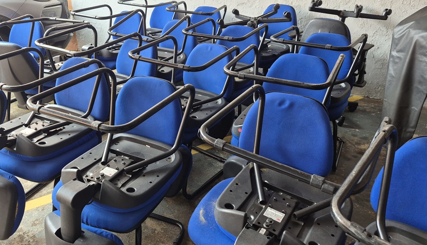 Os itens doados, todos classificados como servíveis, serão utilizados em ações de interesse social. Entre os bens estão cadeiras fixas e giratórias de tecido, parte delas da marca Flexform, anteriormente utilizadas no Escritório Regional de Franca. Os itens doados incluem cadeiras fixas universitárias de tecido e cadeiras giratórias com braços e rodízios, parte delas da marca Flexform.